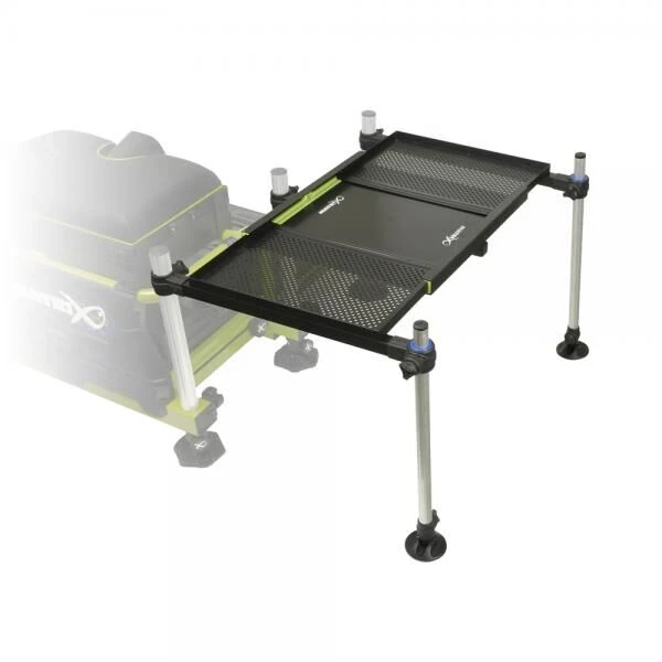 De matrix 3D verstelbare Side Tray heeft ruimte voor 8 stuks 3 pint madendozen. Het universele ontwerp past op de van de meeste zitkisten en wordt bevestig aan 3 poten voor extra stabiliteit. De Side Tray wordt geleverd met 2 telescopische 25mm support poten met moddervoeten. De universele 3D snag-free koppeling- past op 25mm, 30mm & 36mm poten.