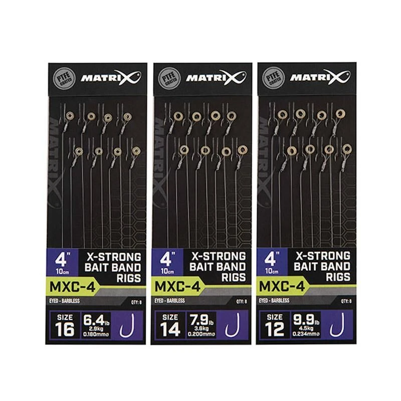 Matrix MXC-4 X-Strong Bait Band Rigs 10cm zijn extra versterkt door het gebruik van dikker onderlijnmateriaal, daarnaast heeft de haak een extra grote haakbocht.