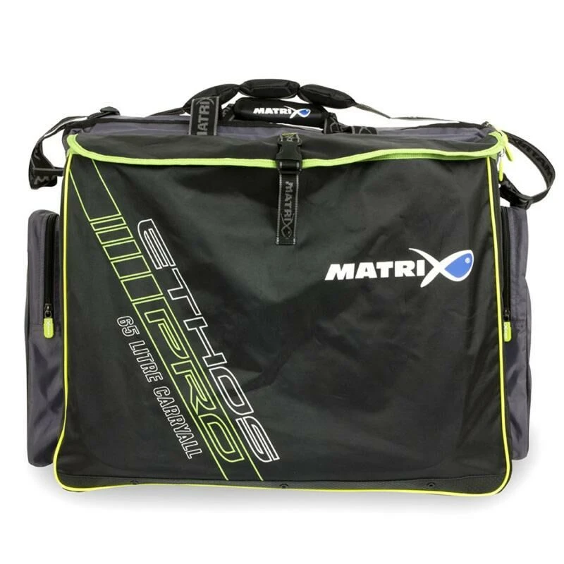 Deze Matrix Ethos Pro 65L Carryall heeft een hoofdcompartiment voor box accessoires, materiaal en aas. Voorzien van buitenvak met rits voor netten, voerzeef, side trays en een vak voor je leefnet. Met een handgreep en verstelbare schouderriem.