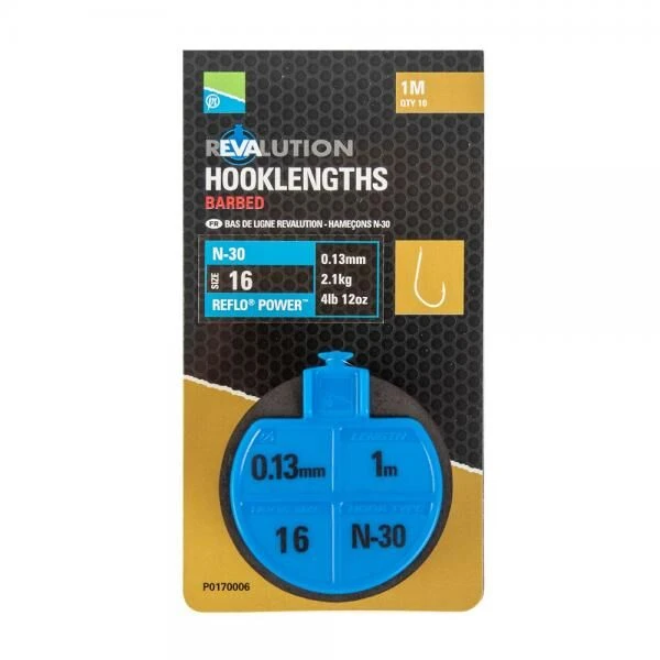 Een range aan topkwaliteit onderlijnen die speciaal ontworpen zijn voor het vissen met de voerkorf. Elke spoel bevat tien 1 meter lange onderlijnen die simpelweg van de spoel gedraaid kunnen worden en aan de hoofdlijn bevestigd kunnen worden. De volgende onderlijn kan vervolgens vastgezet worden met de roterende pen op de spoel, hiermee vervalt het gebruik van losse pennen. Hoge kwaliteit Natural N Series haken zijn bij deze onderlijnen geknoopt aan het beproefde Reflo Power. De onderlijnen kunnen opgeborgen worden in de Revalution bewaardoos, de perfecte oplossing om al je onderlijnen overzichtelijk, droog en beschermd tegen direct zonlicht op te bergen.